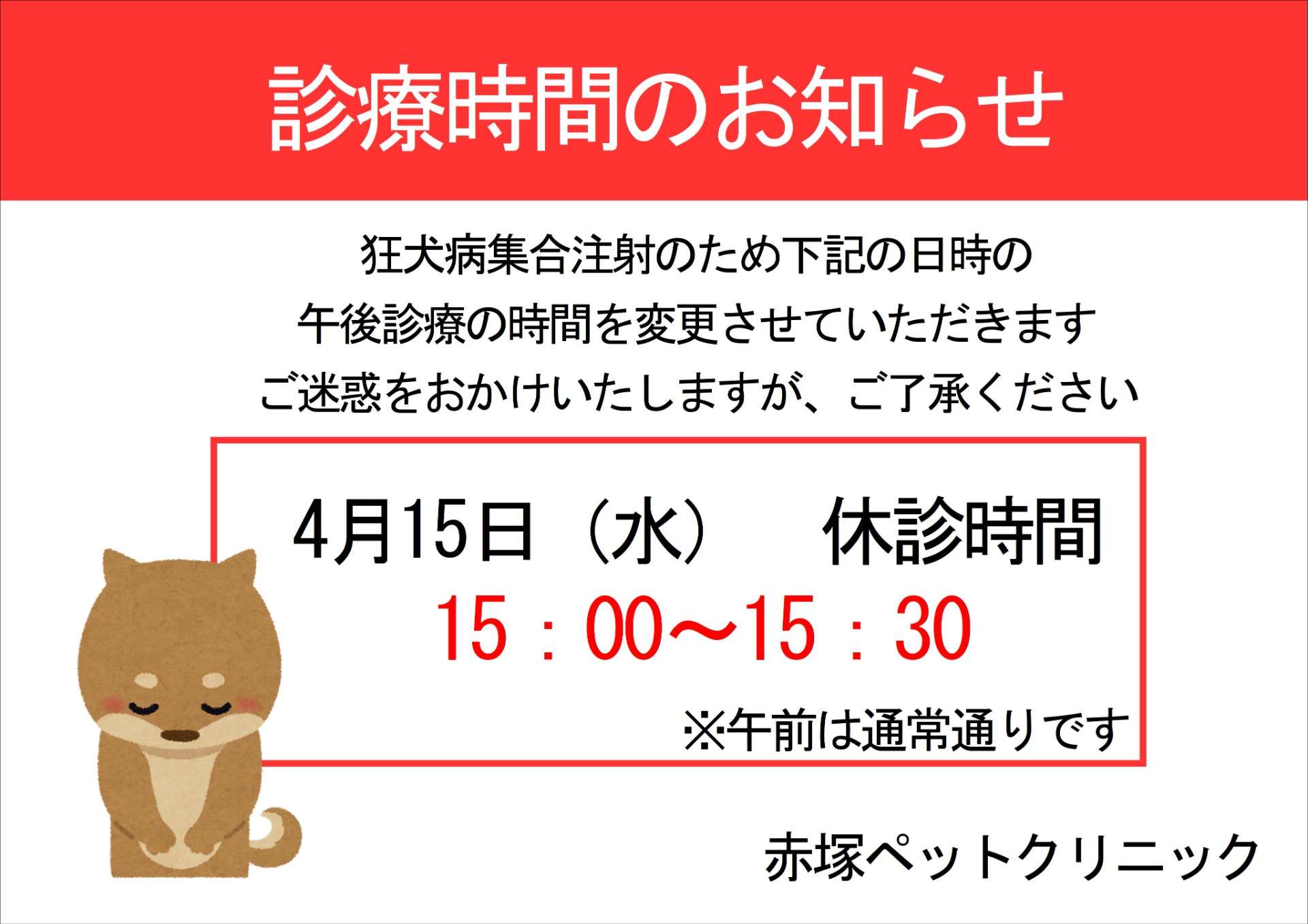 院長が狂犬病集合注射の当番のため、下記の日時で一部休診とさせて頂きます。